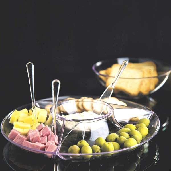 Petisqueira de Acrílico com 3 Divisões 28cm, possui 3 divisórias para petiscos e espaço central para molhos, cremes e patês. Ela é feita de acrílico, material de alta qualidade e perfeito para você levar à sua mesa.
